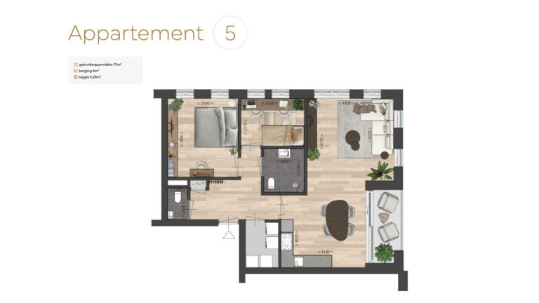 Het appartement beschikt over twee slaapkamers, een moderne badkamer met inloopdouche, wandtoilet en wastafelmeubel, en een separaat gastentoilet. De inpandige berging biedt plaats voor de wasmachine en technische installaties, waaronder de duurzame warmtepomp. Bewoners hebben daarnaast een eigen berging en parkeerplaats. Grote raampartijen zorgen voor veel licht en een ruimtelijk gevoel.