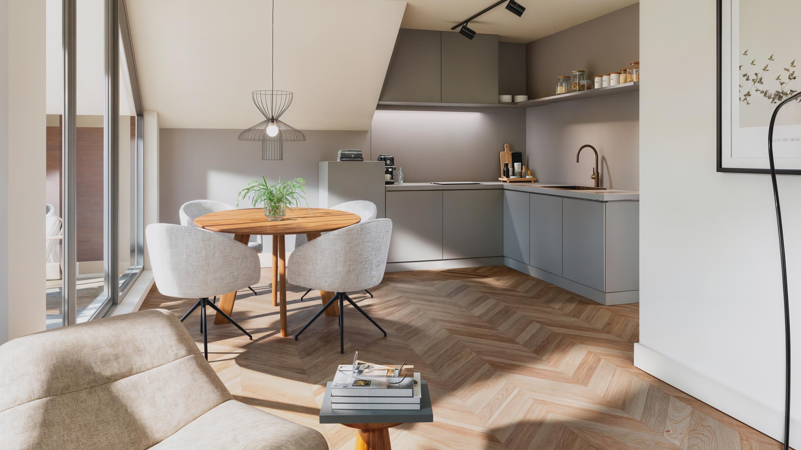 Dit royale appartement op de tweede verdieping van De Meent biedt een fijne woonervaring met veel licht, ruimte en comfort. De ruime woonkamer met grote raampartijen en schuifdeuren naar de loggia van circa 5,25 m² zorgt voor een open, lichte sfeer en prachtig uitzicht over de groene omgeving. De open keuken biedt volop ruimte voor een royale keukenopstelling en vormt het hart van de woning.